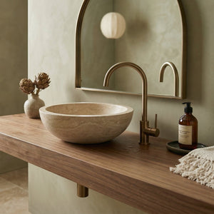 The combination of smooth honed and filled interior and exterior ensures this sink will be the focal point of your kitchen or bathroom decor. The breathtaking light beige travertine from Turkey will blend into any setting. These round honed sinks for the home are not only convenient for everyday use, but also an ornament for your living space. The artisanal construction ensures that no two sinks will be exactly identical.