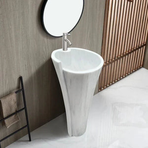 The combination of a smooth, polished interior and chiseled exterior ensures this vessel sink will be the focal point of your bathroom decor. The breathtaking marble from Turkey will blend into any setting. These bowl pedestal sinks for bathrooms are not only convenient for everyday use, but also an ornament for your living space. The artisanal construction ensures that no two sinks will be exactly identical.